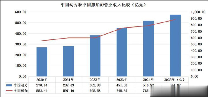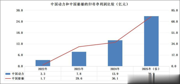 如果我们把时间区间从5年调整为3年,从2022年至2025年(估),中国动力和中国船舶的年收入涨幅分别为50.1%和47.7%。可以发现,两者的收入增速开始趋同。